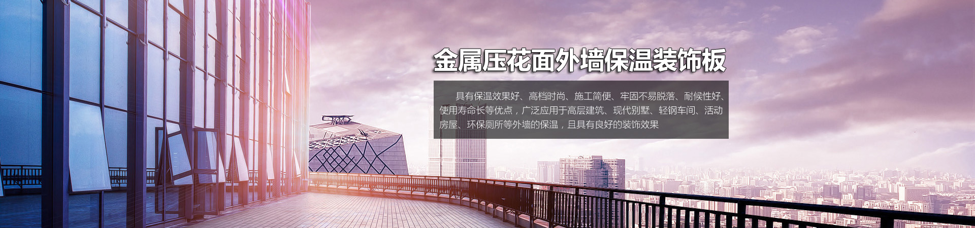公司擁有先進(jìn)的金屬壓花面外墻保溫裝飾板電腦控制自動(dòng)生產(chǎn)線(xiàn),年生產(chǎn)能力40萬(wàn)平方米,可生產(chǎn)磚紋、彈涂紋、水波紋、木紋、礫石、細(xì)石、理石等多種紋樣花型、和多種色彩的產(chǎn)品,能全方位滿(mǎn)足中高檔寫(xiě)字樓、商品住宅樓、現(xiàn)代別墅等建筑外墻保溫及裝飾的需要。【詳細(xì)】